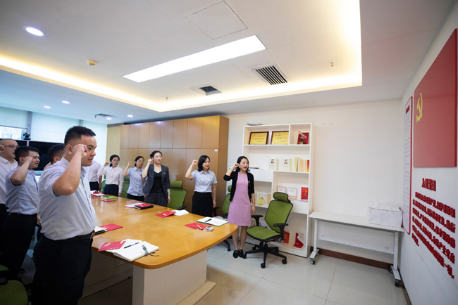 “我志愿加入中國共產黨……隨時準備為黨和人民犧牲一切,永不叛黨。”在公司黨委委員、紀委書記廖紅梅的帶領下,13位公司本部黨員代表列隊肅立,高舉右拳,面對鮮紅的黨旗重溫入黨誓詞,再次莊嚴宣誓,鏗鏘誓詞,強烈震撼著在場每一位黨員;錚錚誓言,充分激發奮斗初心使命,升華黨員覺悟,進一步堅定了對黨的赤膽忠心和為共產主義事業奮斗終身的強烈決心。
